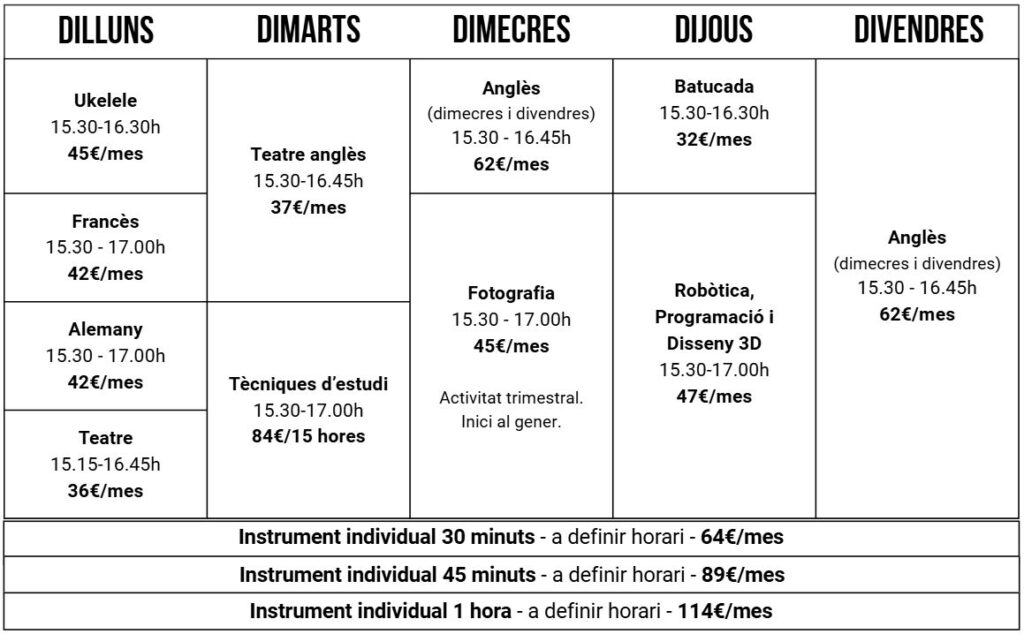Ens referim a aquelles activitats organitzades pel AFA Icària que es fan fora de les hores de classe que amplien els coneixements i les habilitats dels vostres fills. Alguns avantatges significatius són: la possibilitat de socialització; l’oportunitat d’aprendre d’altres maneres i amb altres persones, normes, valors i pautes socials; la possibilitat d’establir relació amb nous amics; la interactuació amb nous referents: noves persones de qui aprendre coses, de qui rebre orientacions, i la possibilitat de descobrir nous interessos i habilitats.